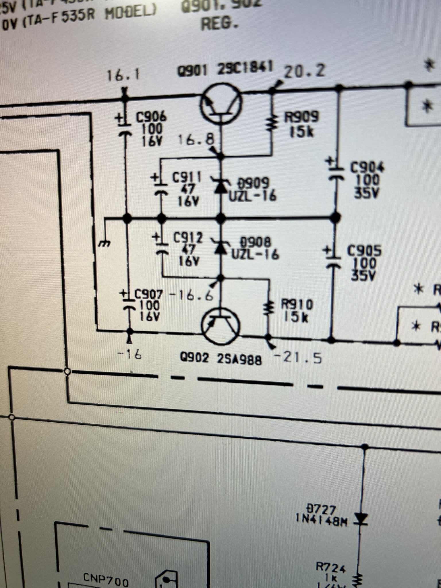 Beim Messen der Versorgungsspannungen ergab sich aber eine starke Abweichung. Am Kollektor von Q901 waren die korrekten 20 Volt vorhanden, aber am Kollektor von Q902 lagen nicht -21V sondern -39V an !?