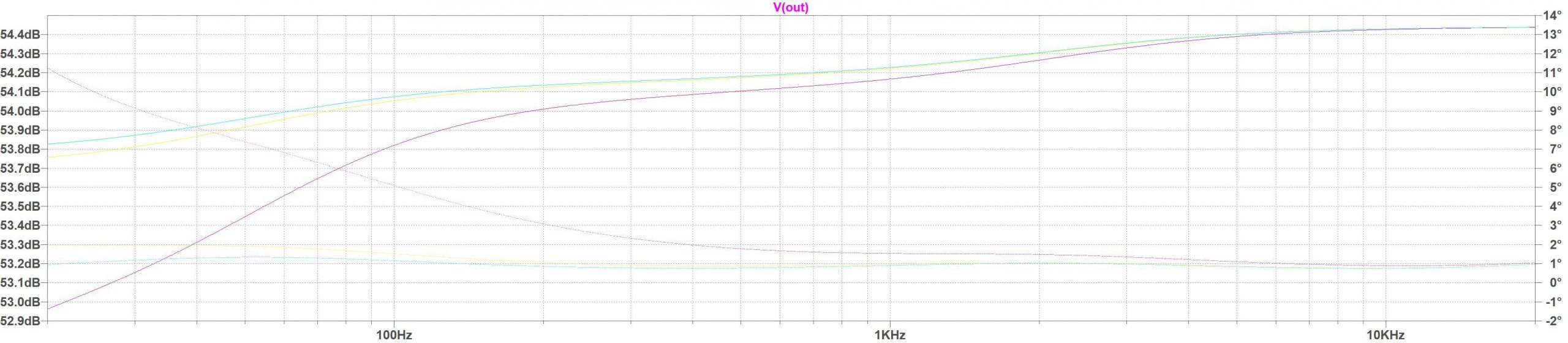 Die Simulation zeigt den Frequenzgang für die Verstärkung als MC-Amp (R14=27 Ohm). Die rosa Kurve stellt die Last 100K dar.