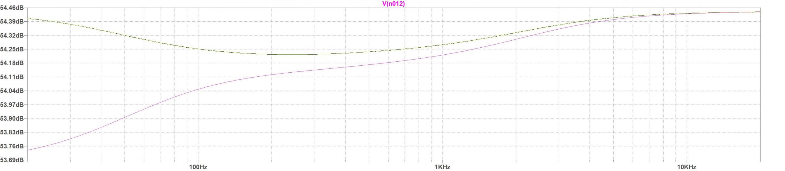 Hinweise in diversen Foren zum Hormann-Supa deuten an, dass durch erhöhen von R15 der Frequenzgang bei tiefen Frequenzen angehoben werden kann. Die entsprechende Simulation mit R15 = 165 kΩ (Originalwert 150 k) bei einer 1 MegΩ Last zeigt eine Korrektur des zu beobachtenden Abfalls tiefer Frequenzen. Siehe grüne Kurve unten.