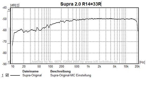 Als Eingangssignal verwende ich eine Inverse-RIAA Kurve (Laplace-Transformation). Bei exakter Entzerrung im VV müsste sich eine gerade Linie ergeben. Da der Entzerrer aber eine theoretische Abweichung von 0,8dB hat, ist eine Welligkeit zu beobachten. Allerdings geht die Kurve bei tiefen Frequenzen unter 150 Hz und einem niedrigen Lastwiderstand am Ausgang des Supra 2.0 deutlich in den Keller.