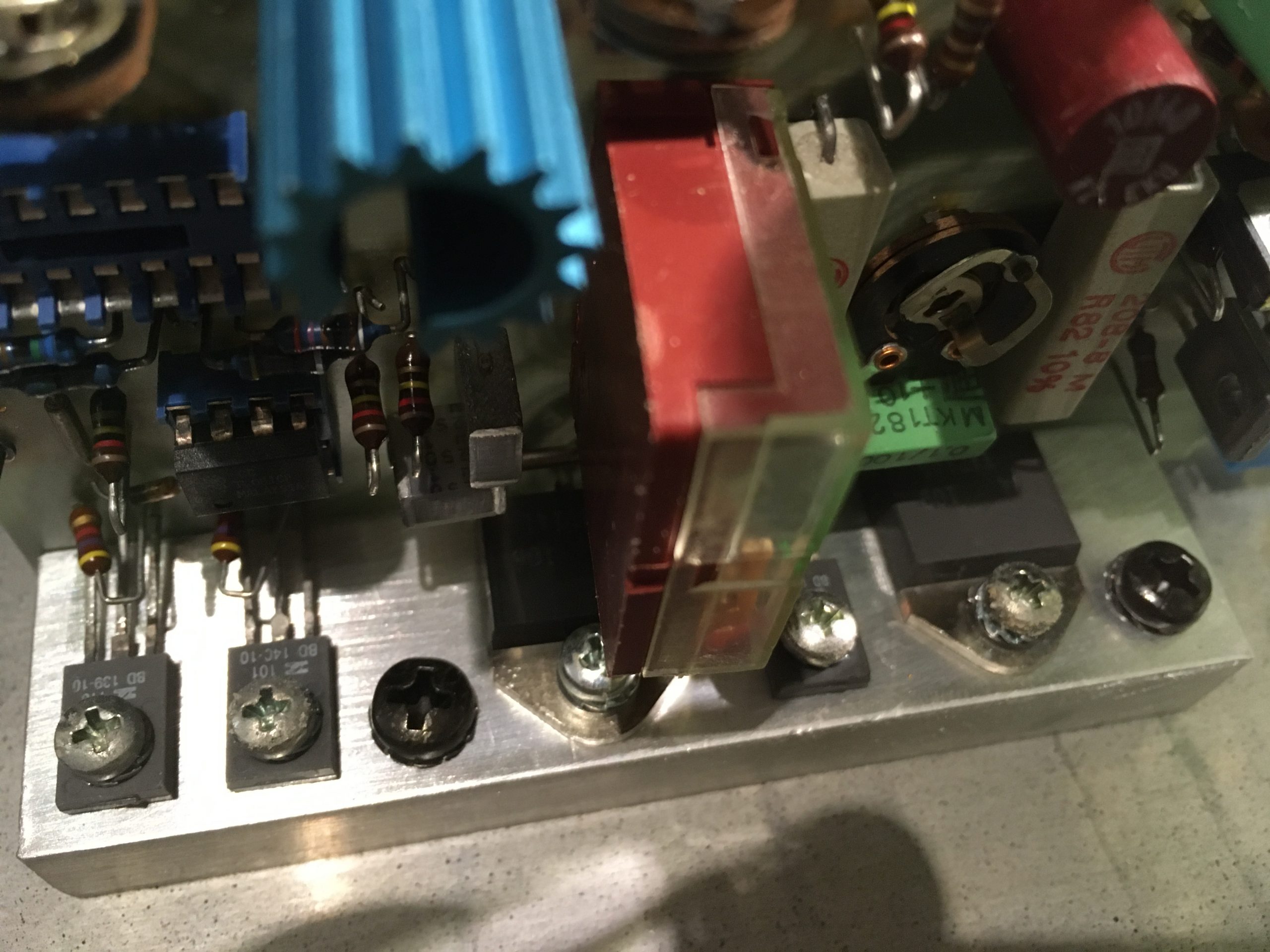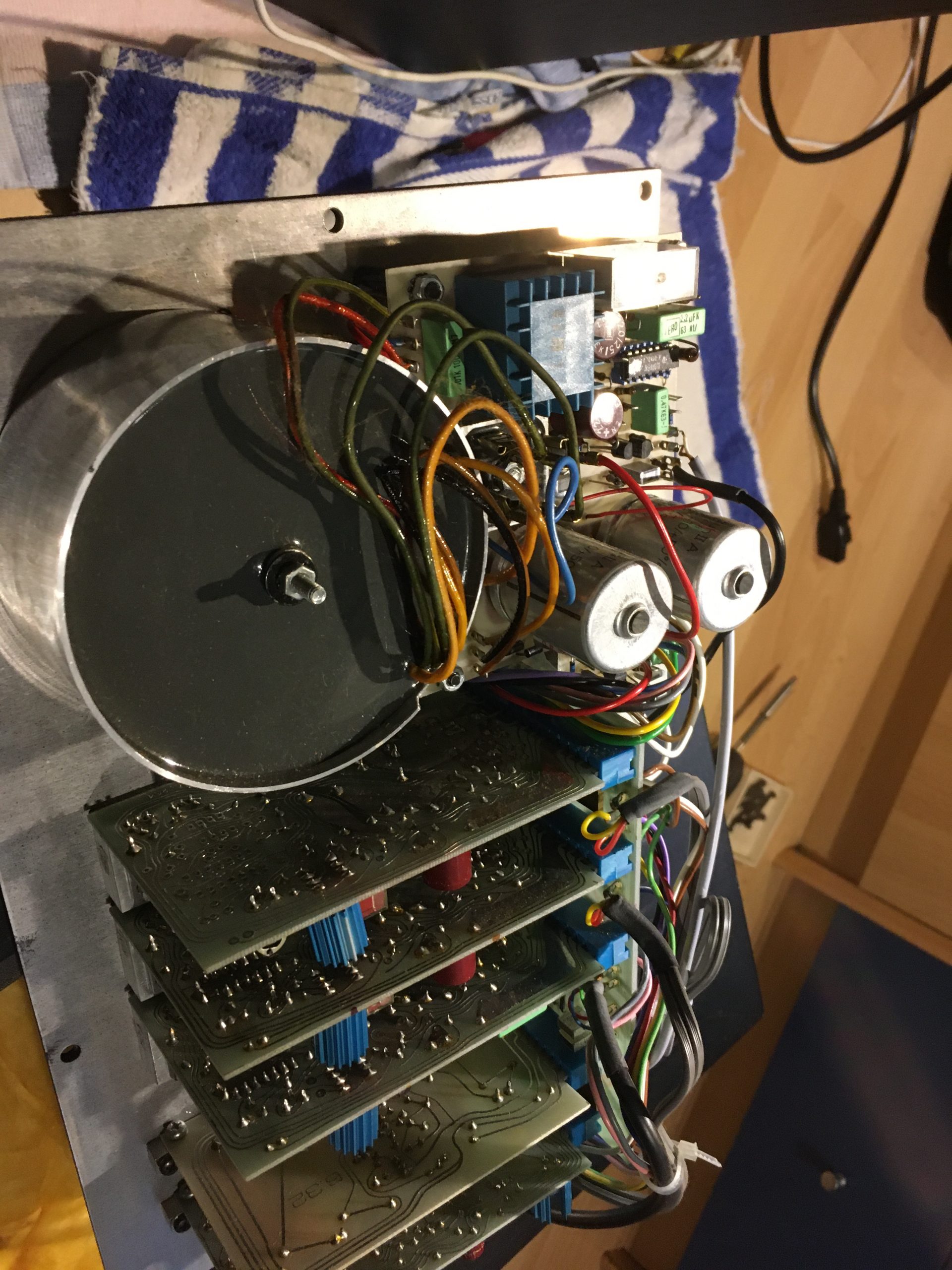 Um zunächst die einzelnen Verstärkermodule zu prüfen, greife ich auf eine Resteverwertung einer ausgeschlachteten BM6 zurück. Folgende Teile habe ich revidiert und auf einem Alublech montiert, so daß es bequem auf den Schreibtsich passt und alle notwendigen Meß und Einstellarbeiten durchführbar sind: