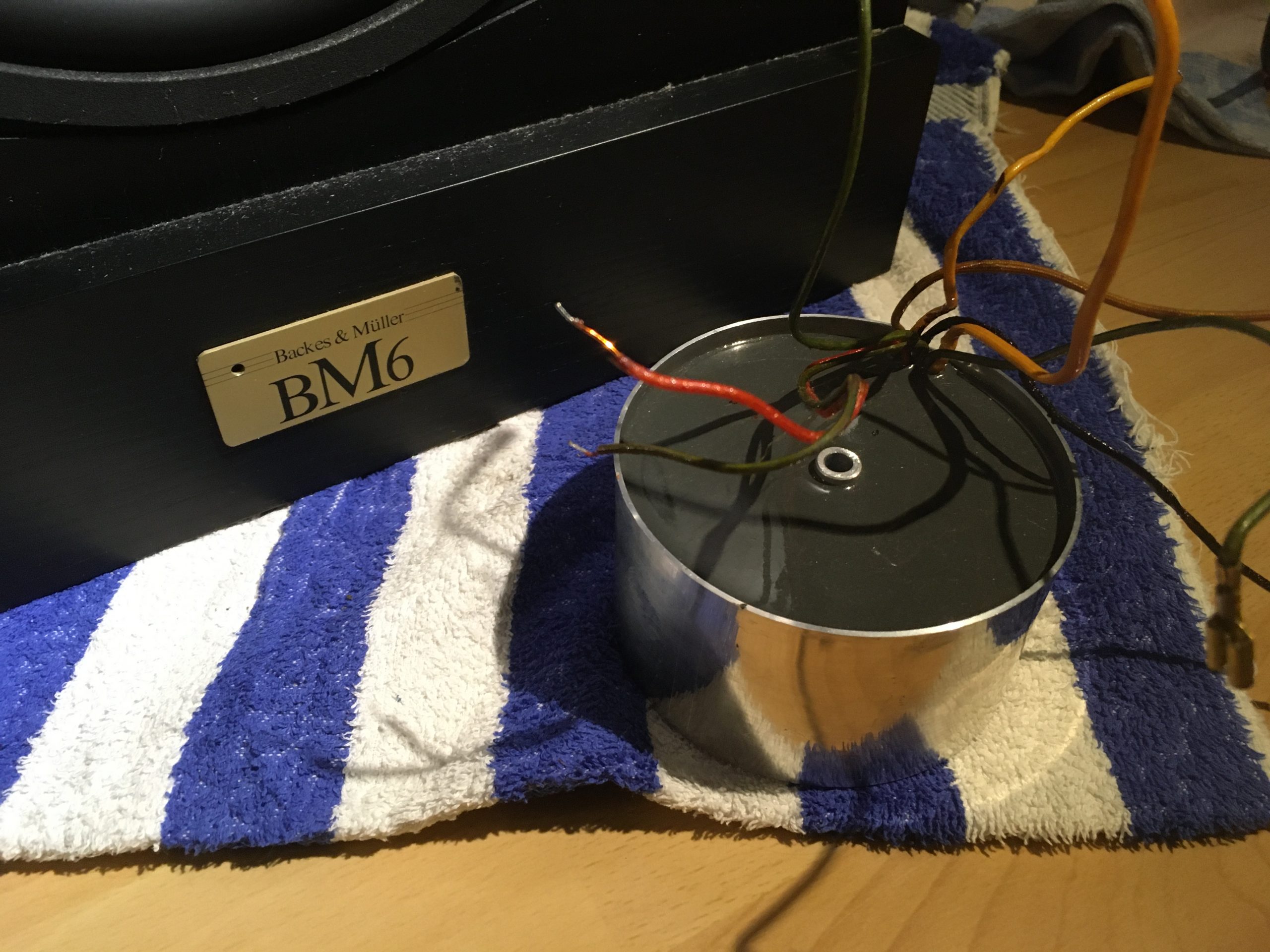 -> hier lag der Hase im Pfeffer: Um an die Rückkopplungsspule heranzukommen, musste die Dustcap des Mitteltöners entfernt werden. Das funktioniert bei dem ursprünglich von Backes und Müller verwendeten Kleber (Braun/Orange) am besten mit einem normalen Haarfön in niedrigster aber heißer Stufe. Der Kleber wird dann „beweglich“ und kann mit einer scharfen Pinzette oder Skalpel vorsichtig entfernt werden.